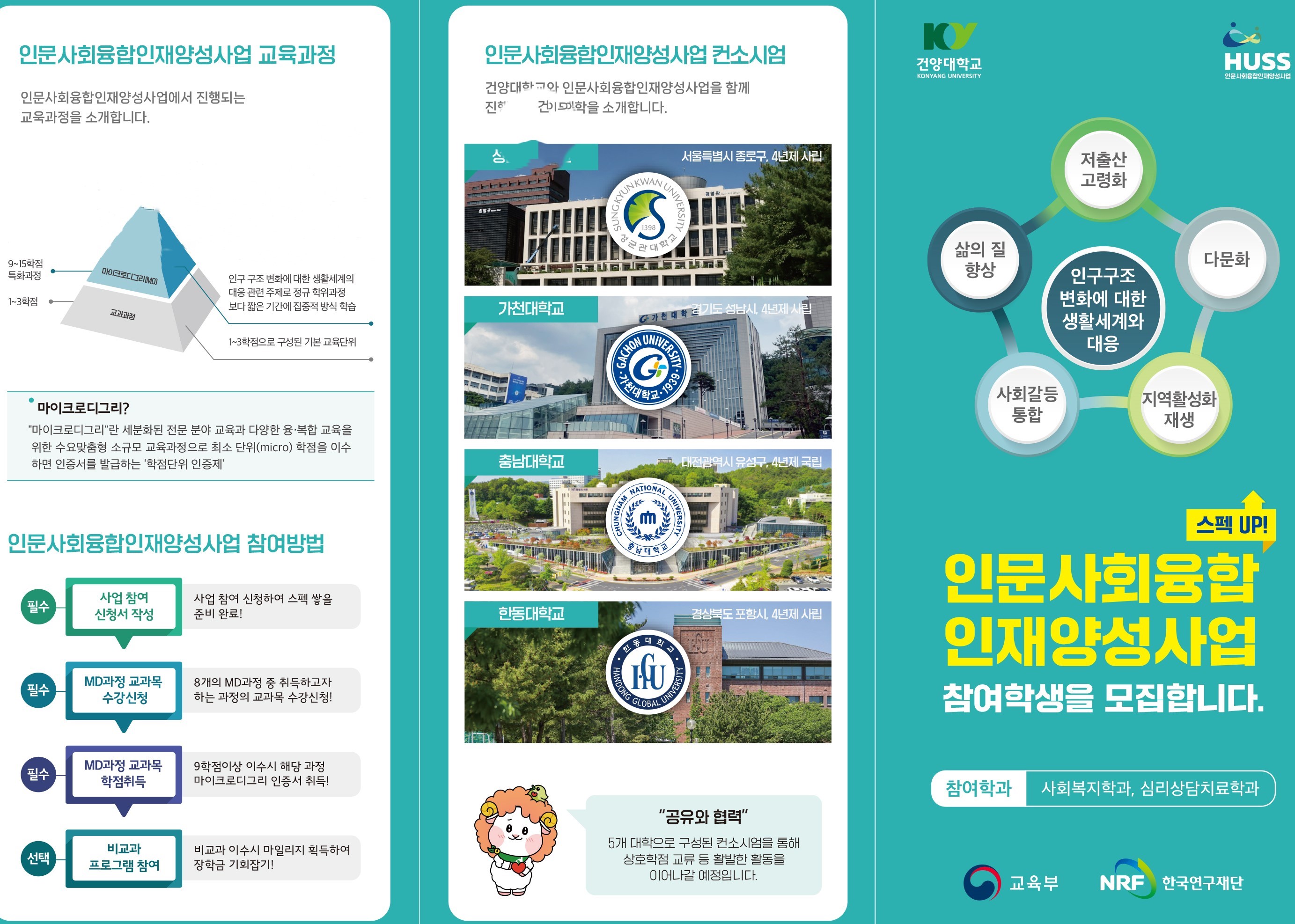 - 어떤 내용? 희망하는 MD 과정을 신청하고 9학점 이상을 취득하면 MD 수여 - 어떻게 참여? MD 신청서 작성 후 제출하고, MD별 교과목을 수강 (기존 수강 과목은 이수 처리됨. 단, 수강한 과목 적용 시점은 논의 중) - 세부 내용? 첨부한 MD 사업 브로셔 참고 - 제출기한? 11.3(금) - 제출처? 첨부한 신청서를 작성하여, 김은혜 교수 이메일로 제출 94218690@konyang.ac.kr or 학과 행정실에 비치되어 있는 신청서 작성 후, 유성희 선생님께 제출 - 문의사항? 사업 오픈채팅방 통해서 문의(하단 링크 또는 방 이름 검색) https://open.kakao.com/o/gzoTxYOf 건양대 인문사회융합인재양성사업 질문방