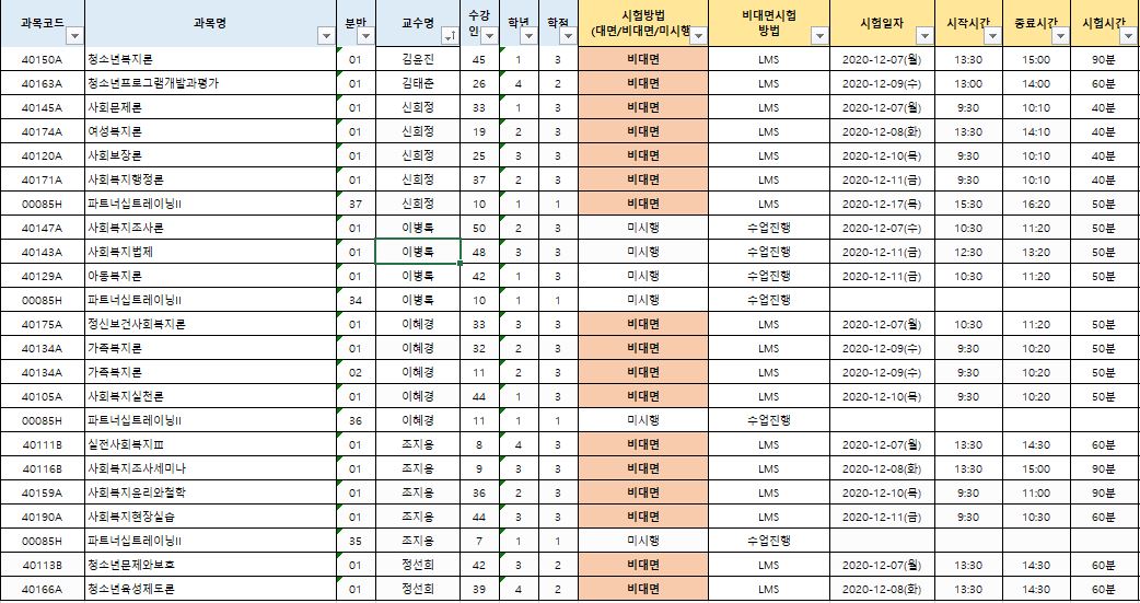 제목 사회복지학과 개설 기말고사 일정 안내