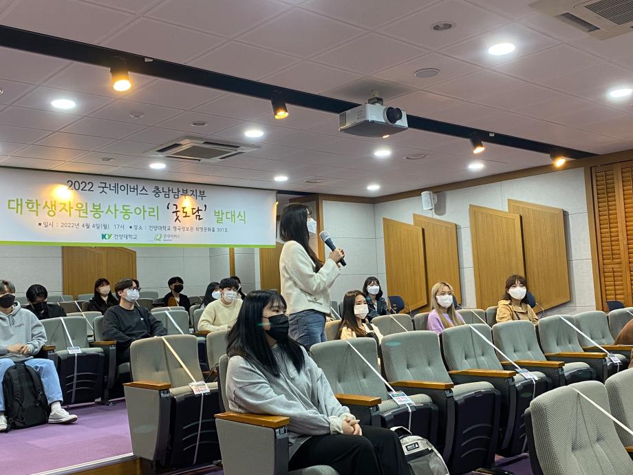 2022년 4월 4일(월) 17~18시까지 명곡도서관 희영문화홀에서 굿네이버스 충남남부지부 대학생자원봉사동아리 ‘굿도담’ 발대식이 진행되었습니다.