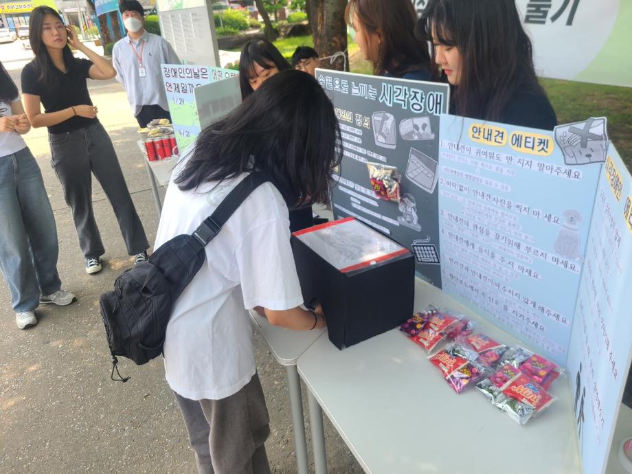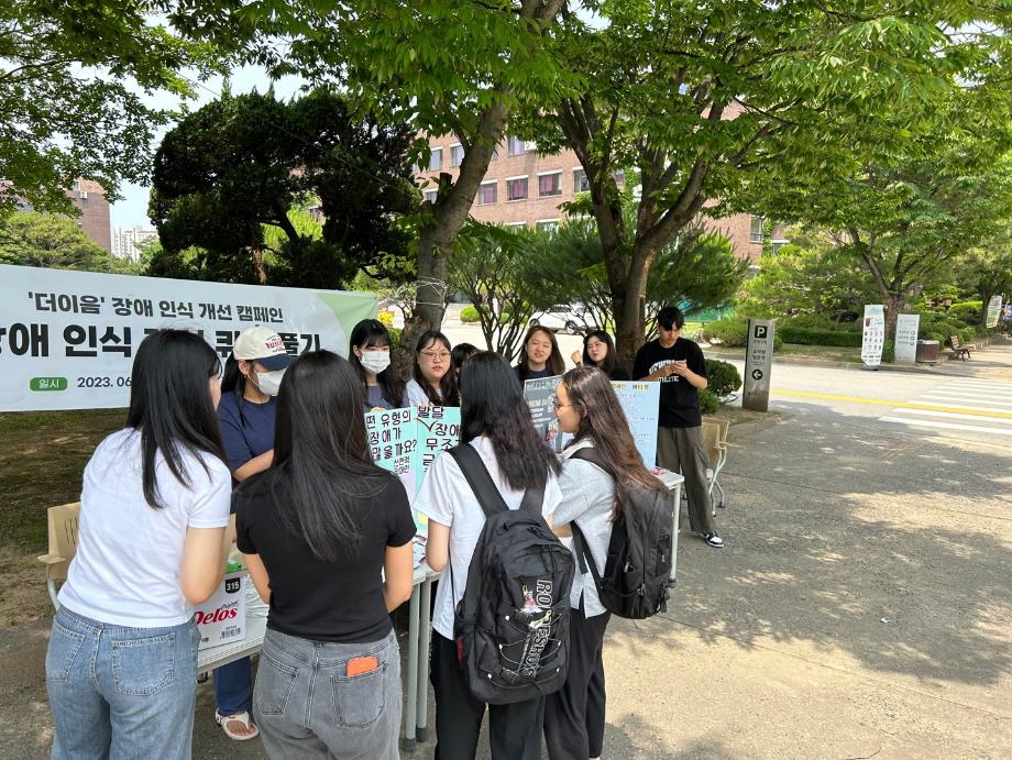2023년 6월 5일 10시부터 13시까지 건양대학교 정문에서 사회복지학과의 동아리인 ‘맨도롱또똣’과 ‘논산시사람꽃복지관’이 함께하여 장애에 대한 인식을 개선하는 것을 계기로, ‘장애인식개선캠페인’을 주최하였습니다. ‘맨도롱또똣’ 동아리 임원들과 ‘논산시사람꽃복지관’은 장애인의 날, 장애의 유형, 점자 체험을 하는 등 장애에 대해 알아보는 퀴즈를 진행하였습니다. 건양대학교 정문에서 활동을 진행하여 건양대학교를 오고 가는 모든 학생들을 대상으로 장애인식개선캠페인을 진행함으로써 학생들의 적극적인 참여를 통해 장애에 대한 인식과 의견을 파악하는 모습을 보여주었습니다. |