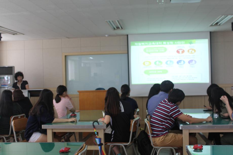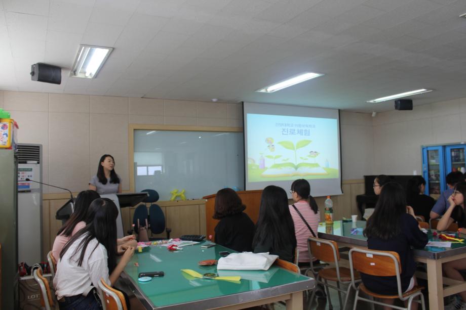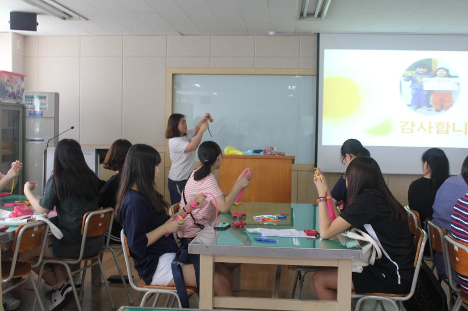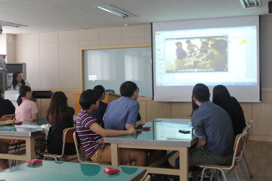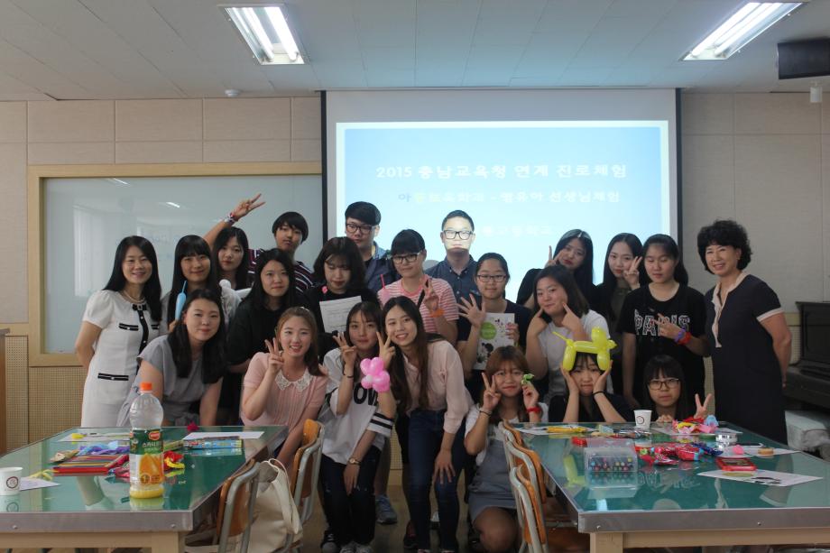 2015년 07월18일 '미래의 영유아 선생님 체험' 1차 첫번째 진로체험을 '계룡고등학교' 친구들과 함께 하였습니다. 저희 아동보육학과에 대한 소개와 5개 동아리(아레, 종이세상,도란도란,프티푸페,보물상자) 활동들을 직접 체험해 보는 시간을 가졌고 졸업하신 선배님께서 학생들에게 힘이 될 수 있는 특강을 해 주셨습니다. 마지막으로 우리학과에서 가장 큰 행사인 '학술제'영상을 시청 하며 유익한 시간들을 보냈습니다.^^