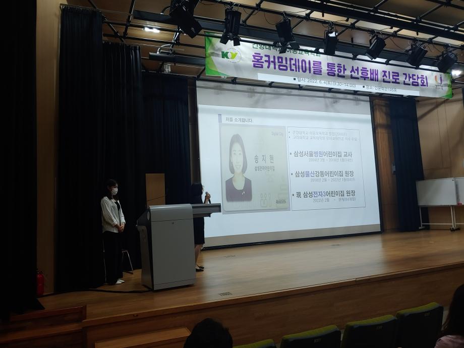 아동교육학과에서는 6.4(토)에 학과 초청으로 졸업생 19명이 모교를 방문한 가운데 <홈커밍데이를 통한 선후배 진로간담회>를 개최, 다양한 기관에 취업한 졸업 선배의 실질적인 재직 경험을 전달하는 특강을 진행하고 아동교육 직무에 대한 다양한 의견을 교환하며 선후배간 소통과 인적교류 기반을 조성한 바 있습니다. 아동교육학과 학회장을 맡고 있는 천다희(3학년, 20학번)양은“지난 2년간 코로나19로 인해 학과 활동에 제약이 많았지만 <홈커밍데이> 프로그램 참여를 통해 선배들을 직접 만나서 직장 간접경험도 해보고 위로를 들으며, 취업에 필요한 정보도 얻을 수 있었다. 아이들에게 희망과 즐거움을 주는 보육교사가 되고 싶다“는 포부를 밝혔습니다.
