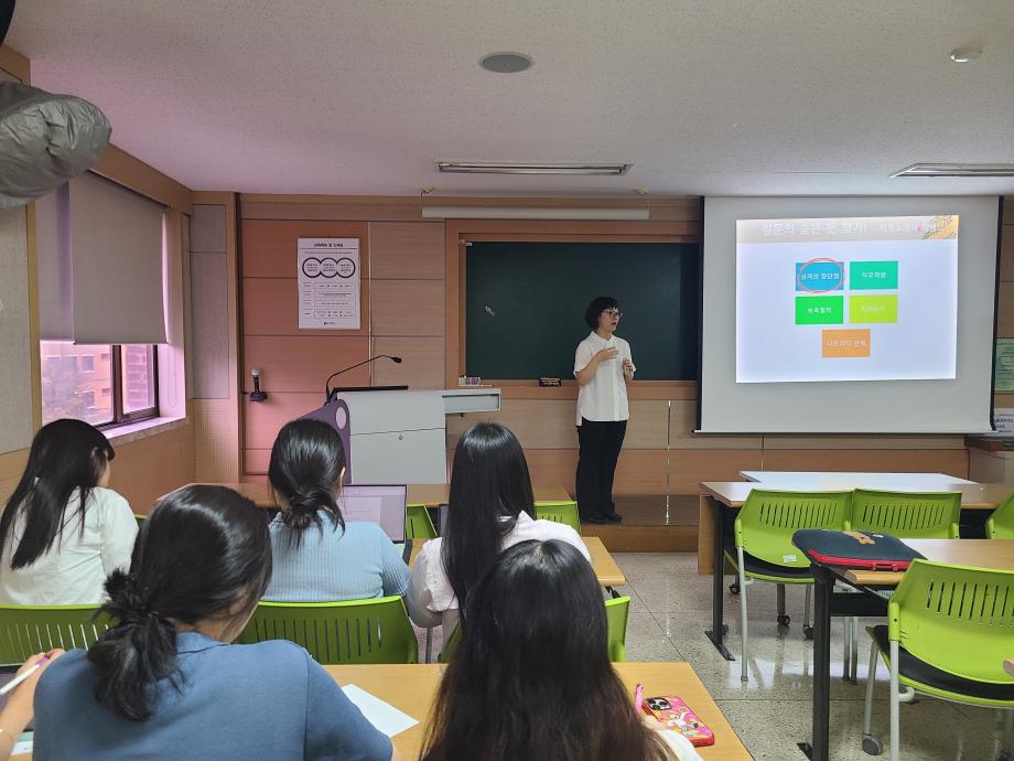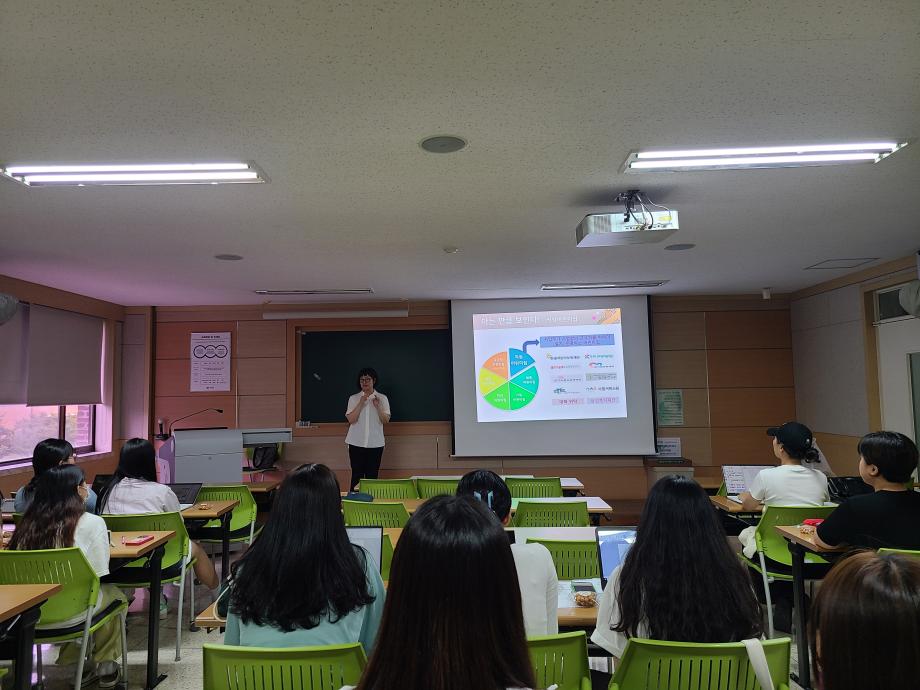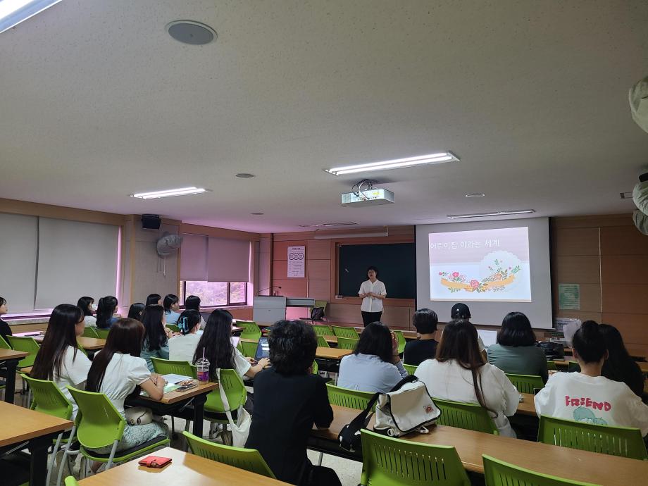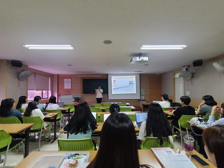 아동교육학과에서는 재학생의 진로설계 및 취업지원 강화를 위하여 <2023년 취업진로 아카데미> 프로그램을 개최하였습니다. 5.18(목)과 5.23(화)에 이어 9.14(목)에 진행된 이번 특강은 전의산단공동직장어린이집의 서정은 원장이 <어린이집이라는 세계>를 기본 주제로 하여 재학생 21명에게 어린이집 취업을 위한 필요한 자기소개서 작성 및 면접준비 방법 등을 알기쉽게 강의한 바 있습니다.