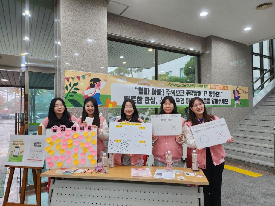 아동교육학과에서는 학과와 연관하여 아동에 대하여 신체적, 심리적, 성적으로 학대하거나 돌보지 않고 방치하는 경우가 발생하지 않도록 주변의 관심을 유도하고자 <아동학대예방 켐페인>을 매년 진행하고 있습니다.