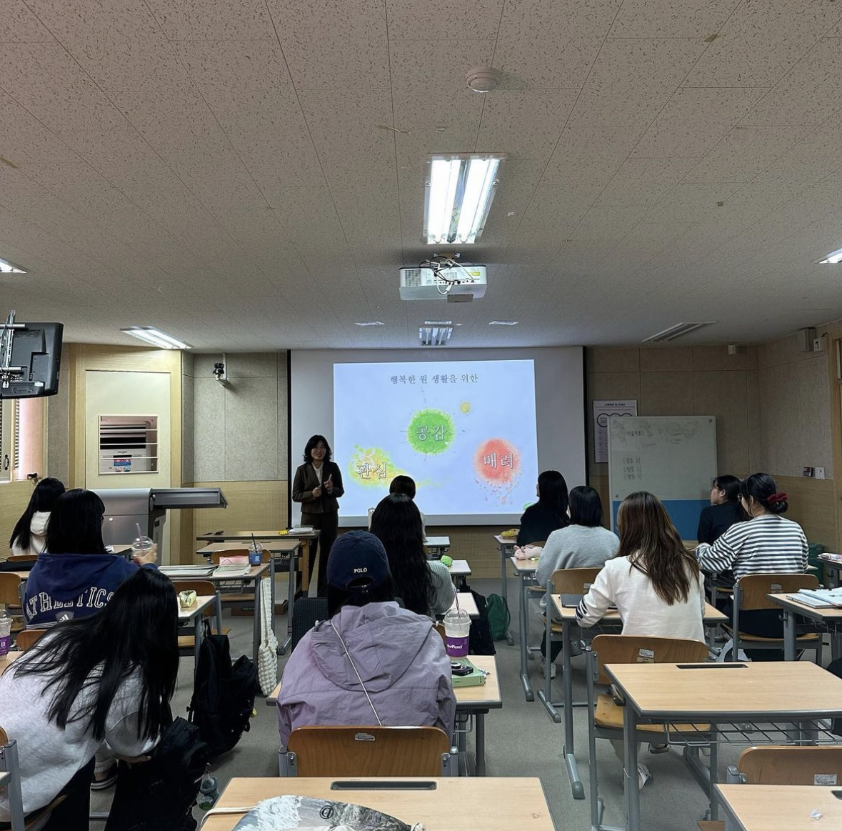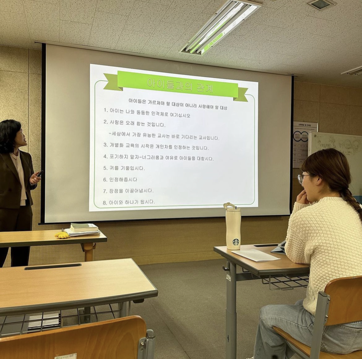 오늘은 논산 프라임 세도 어린이집 원장 선생님께서 행복한 원 생활을 위한 교사의 소양과 자질에 대해 특강을 진행해 주셨습니다! 자신에 대한 이해, 동료 교사 및 원장 선생님과의 관계, 학부모와의 관계, 아이 들과의 관계 등 취업 후 원 생활에 관한 좋은 정보를 알아갈 수 있는 뜻깊은 시 간이었습니다:) 바쁘신 와중에 귀한 시간 내 주신 원장 선생님께 진심으로 감사드립니다