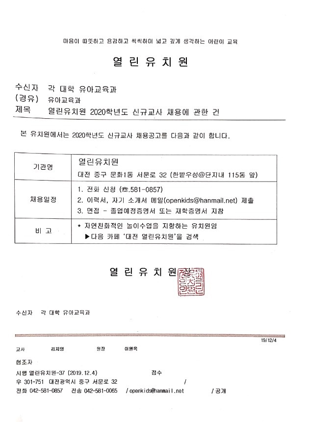 『 열린유치원 2020학년도 신규교사 채용에 관한 건 』글의 상세내용을 확인하는 표로 제목, 부서명, 등록일, 조회, 첨부, 내용으로 나뉘어 설명합니다.