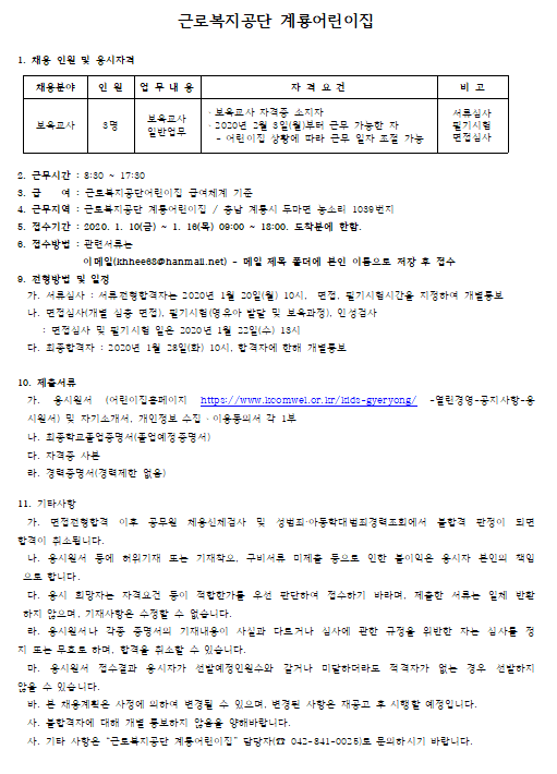 『 근로복지공단 계룡어린이집 채용공고 』글의 상세내용을 확인하는 표로 제목, 부서명, 등록일, 조회, 첨부, 내용으로 나뉘어 설명합니다.