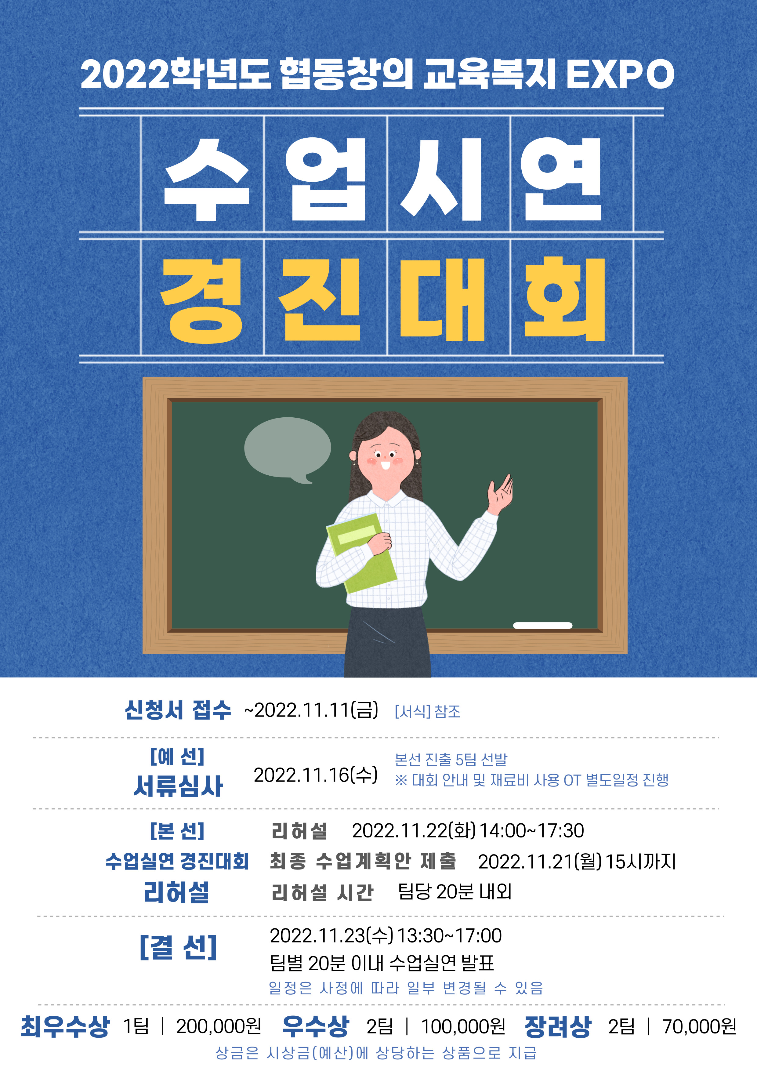 『 2022학년도 협동창의 교육·복지 EXPO 수업 실연 경진대회 참가 신청 안내 』글의 상세내용을 확인하는 표로 제목, 부서명, 등록일, 조회, 첨부, 내용으로 나뉘어 설명합니다.