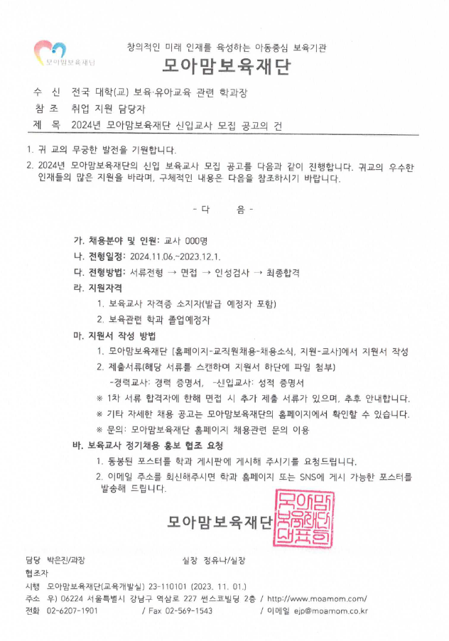 『 2024년 모아맘보육재단 신입교사 모집 공고의 건 』글의 상세내용을 확인하는 표로 제목, 부서명, 등록일, 조회, 첨부, 내용으로 나뉘어 설명합니다.
