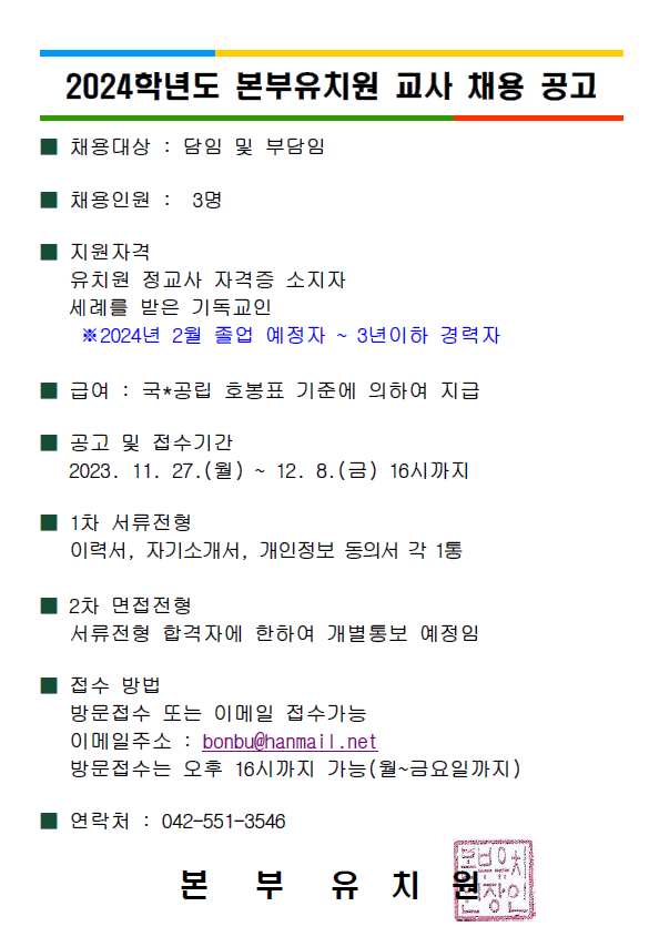 『 2024학년도 충남 계룡시 본부 유치원 교사 채용 공고 』글의 상세내용을 확인하는 표로 제목, 부서명, 등록일, 조회, 첨부, 내용으로 나뉘어 설명합니다.