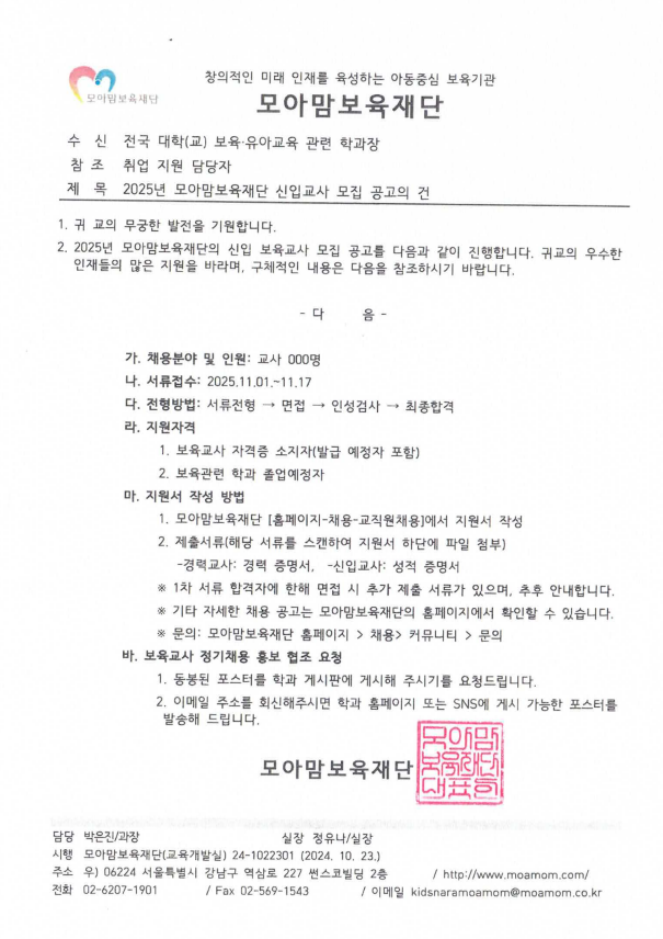 『 2025년 모아맘보육재단 신입교사 모집 공고 』글의 상세내용을 확인하는 표로 제목, 부서명, 등록일, 조회, 첨부, 내용으로 나뉘어 설명합니다.
