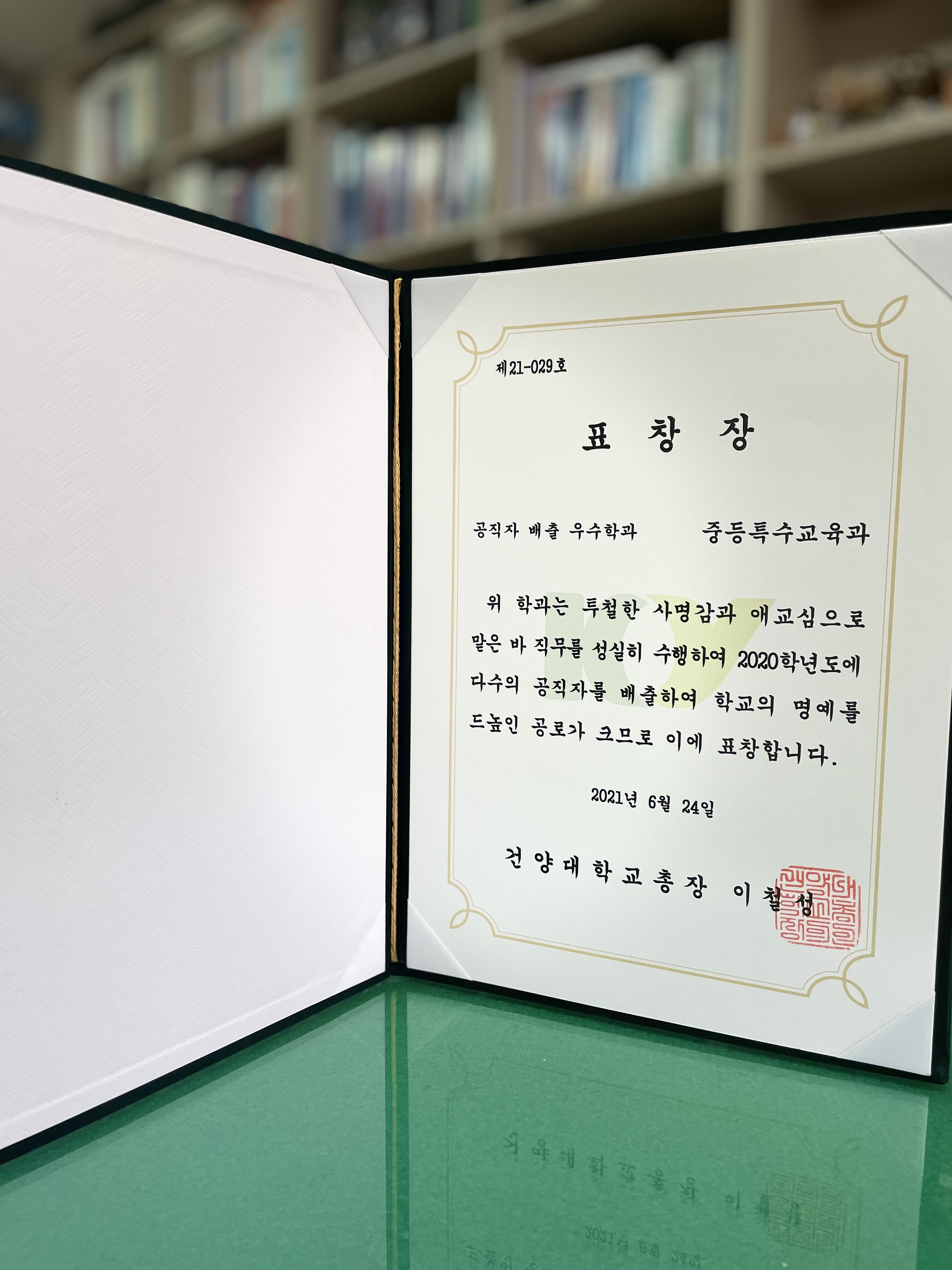 우리 건양대학교 중등특수교육과가 특수교사 임용시험에서 좋은 성과를 내는 것에 대해 우리 대학에서 인정을 해주셨네요. 올해 처음으로 신설된 건양대학교 "공직자 배출 우수학과"로 우리 학과가 선정, 포상을 받았습니다. 모두 축하해주세요.