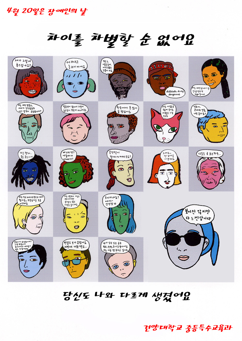 우리 학과 재학생들이 제34회 장애인의 날을 맞이하여 대학생 및 고등학생을 대상으로 한 장애인식 개선 홍보 활동을 전개하였다. "차이를 차별할 순 없어요"라는 주제로, 한 팀의 학생들은 일반 대학생들이 장애를 바라보는 관점에 변화를 일으킬 수 있길 바라면서 준비한 장애인식 개선 포스터를 대학 내 여러 게시판에 부착하는 활동을 하였고, 다른 한 팀의 학생들은 논산여자고등학교를 방문하여 등굣길의 고교생들을 대상으로 장애인식 개선 홍보 활동을 하였다.