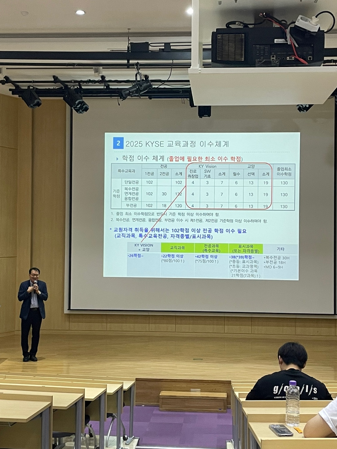 25학번 키세 1학년들의 전공선택에 도움을 주기 위해서 교육과정 안내 및 전공 관련 간담회를 개최하였습니다(9.11). 교사자격 취득을 위한 교과목 이수와 학점 체계에 대해서도 배우고, 초등전공, 중등전공, 복수자격취득, 복수전공까지 다양한 진로 옵션에 대해 알 수 있는 귀한 시간이었습니다. 이후 25학번 키세들은 지도교수님과의 진로-전공 상담을 하게 되구요. 각자 관심있는 전공과 진로 방향을 결정하게 됩니다. 특수교육에 열심인 우리 키세 25학번 여러분을 응원합니다!! |