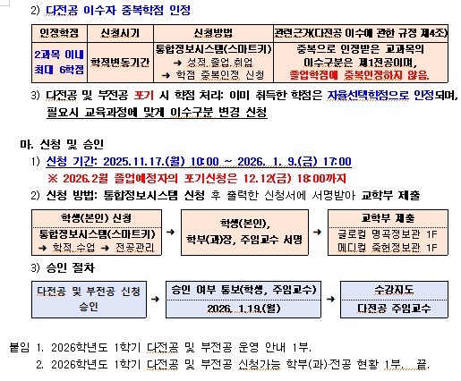 | 제목 | 2026학년도 1학기 다전공 및 부전공 신청(신규, 포기) 안내 | ||||
