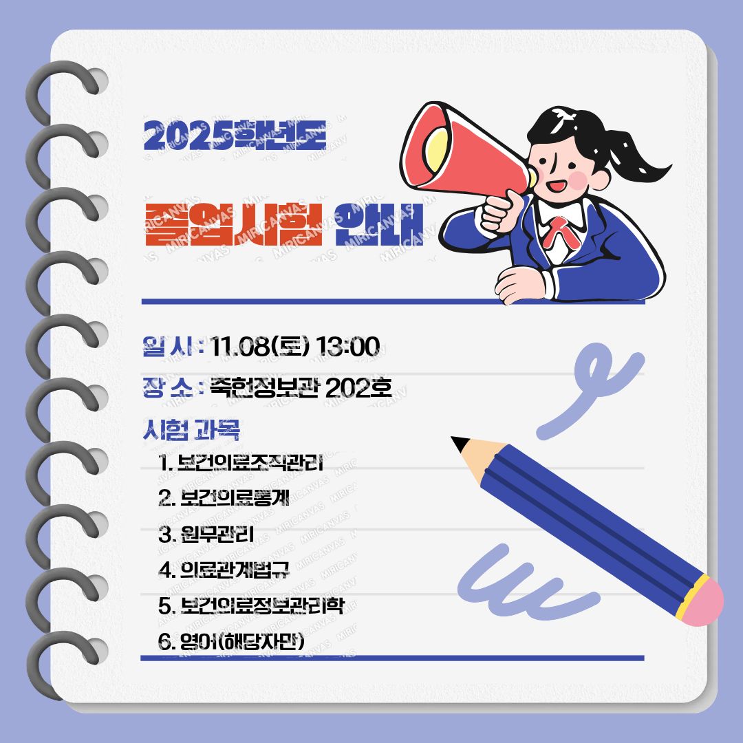 『 2025학년도 2월 졸업예정자 졸업시험 안내 』글의 상세내용을 확인하는 표로 제목, 부서명, 등록일, 조회, 첨부, 내용으로 나뉘어 설명합니다.