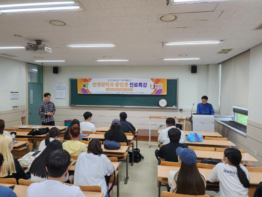 5월 4일 목요일에 1,2 학년 대상으로 졸업생 진로특강이 진행되었습니다. 강사는 건양대학교병원에서 근무하는 검안사로서 주제는 "건양대학교병원과 검안사"였습니다. 취업 경험 공유 및 병원 업무 멘토링을 통해 병원 취업에 필요한 실질적인 정보를 제공받을 수 있는 기회였습니다. 모쪼록 취업역량 강화에 도움이 되었기를 바랍니다. |