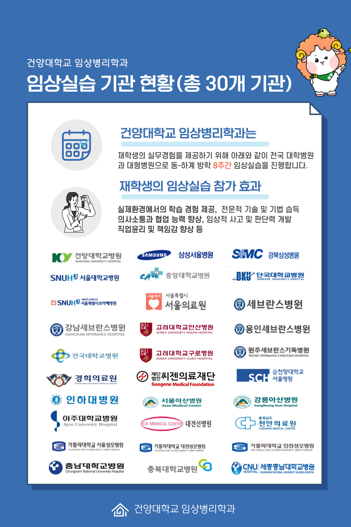 『 2023학년도 임상병리학과 임상실습 기관 현황 』글의 상세내용을 확인하는 표로 제목, 부서명, 등록일, 조회, 첨부, 내용으로 나뉘어 설명합니다.