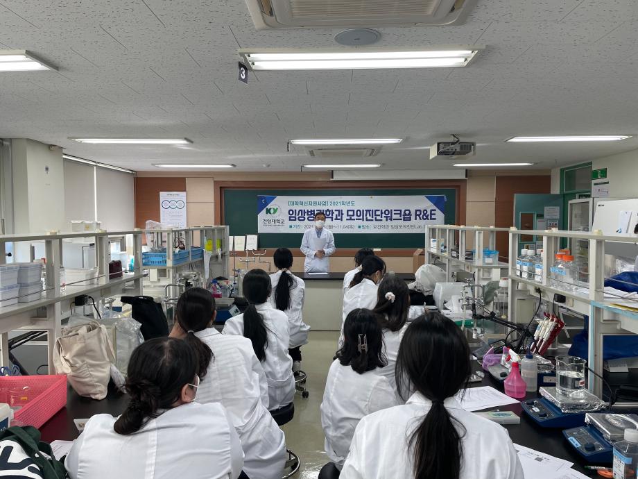 - 기간 : 2021. 10. 25(월) ~ 11. 4(목) - 대상 : 임상병리학과 1~4학년 재학생 - 내용 : 전문임상병리사 양성을 위한 전문화된 6개 영역의 특성화 교육과정 및 각 분야별 실습워크숍 심화 진행