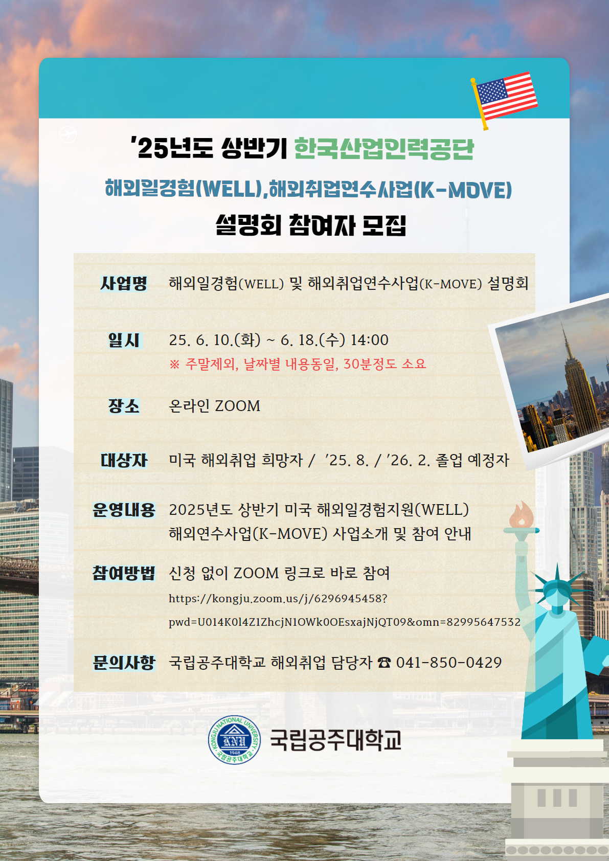 | 제목 | 2025년도 상반기 미국 해외일경험(WELL) 및 해외취업연수사업(K-MOVE) 설명회 참여 안내 및 협조 요청 | ||||