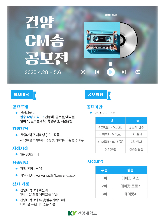 『 건양 CM송 공모전 』글의 상세내용을 확인하는 표로 제목, 부서명, 등록일, 조회, 첨부, 내용으로 나뉘어 설명합니다.