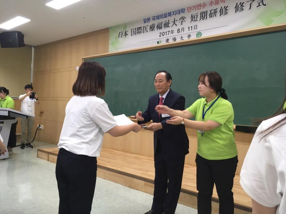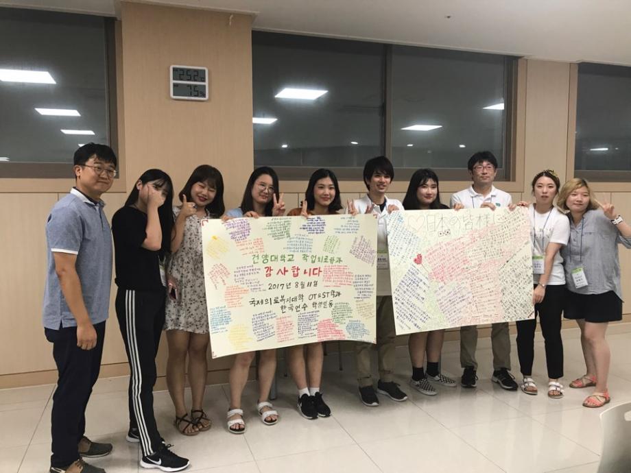 일본 국제의료복지대학 작업치료학과와의 학술, 문화교류를 위해 건양대학교 대전캠퍼스에서 2017년 8월 3일부터 12일까지 9박 10일간 진행되었던 단기연수프로그램이 성황리에 마무리 되었습니다. 이번 연수기간 동안에는 일본 학생 23명과 인솔(후쿠이유즈루) 교수님께서 함께 해 주셨고, 작업치료학과 8명의 학생과 중어일본어학과 통역학생과 의과대학 통역학생이 함께 참여해 주셨습니다. 한국 대학교병원과 복지관 등의 작업치료실 실습방문과 특강(언어치료, 고령화시대 치매현황)과 함께 유익한 시간을 보냈습니다. 수료식까지 도움 주신 여러 학생 여러분과 함께 해 주신 교수님들께 감사드립니다.