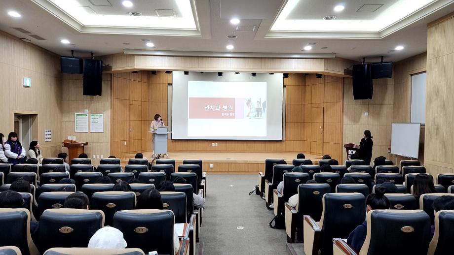 지난 11월 20일 치위생학과 현장임상실습 성과보고회가 개최되었습니다 2,3 학년 전 학생이 모여 실습 기관별 특성을 반영한 정보를 공유하였고 3학년 1학기 실습을 대비하여 선배가 후배들에게 실습관련 자세한 정보전달 및 기관별 질의 응답시간을 개최했습니다 이번 현장임상실습 성과보고회에서는 선치과병원 김이순 팀장님이 참여하여 학생 실습시 사전준비사항, 실습시 고려사항, 좋은 성과를 얻는 방법을 알려주었습니다