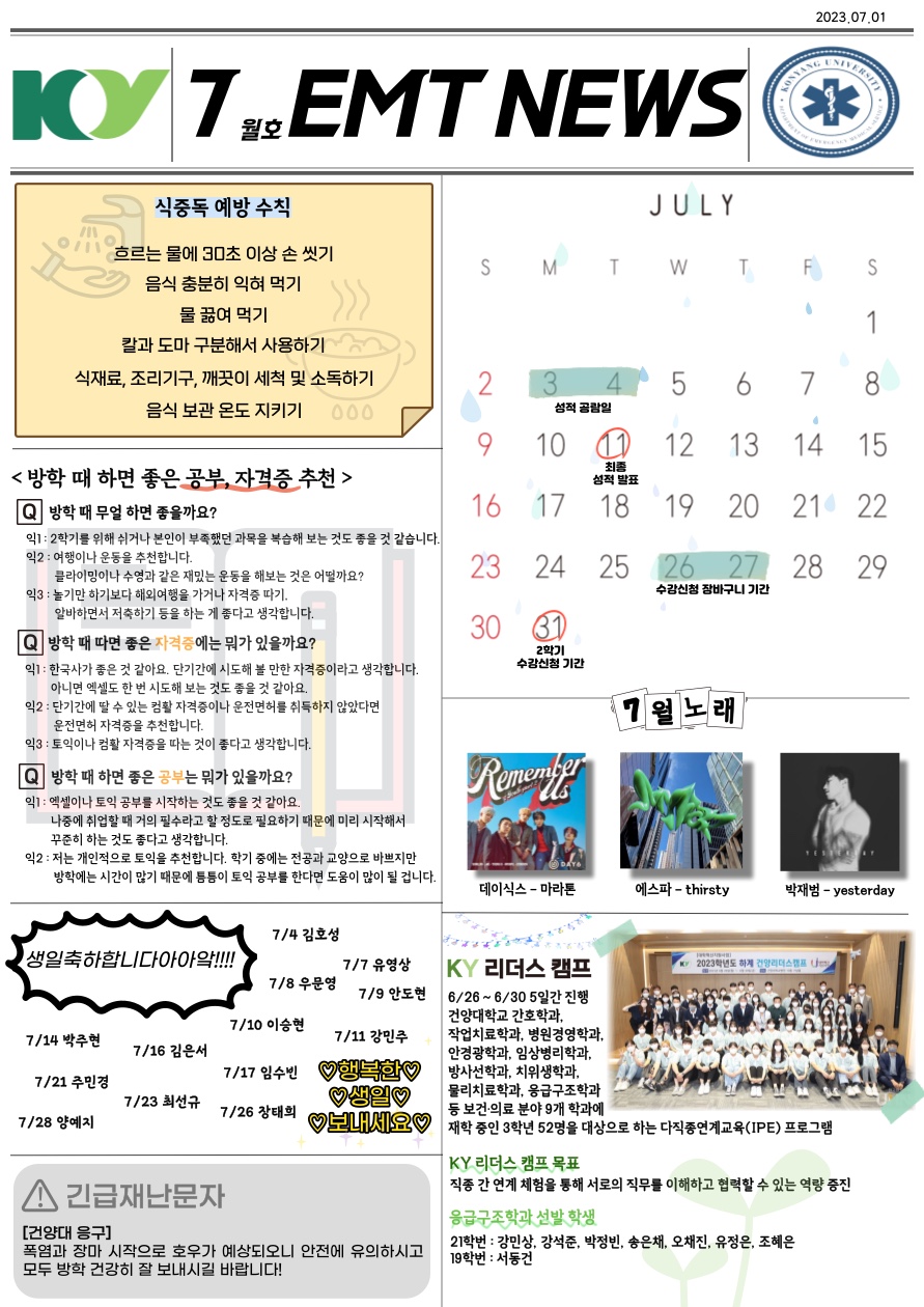 『 2023년 7월 EMT NEWS 』글의 상세내용을 확인하는 표로 제목, 부서명, 등록일, 조회, 첨부, 내용으로 나뉘어 설명합니다.