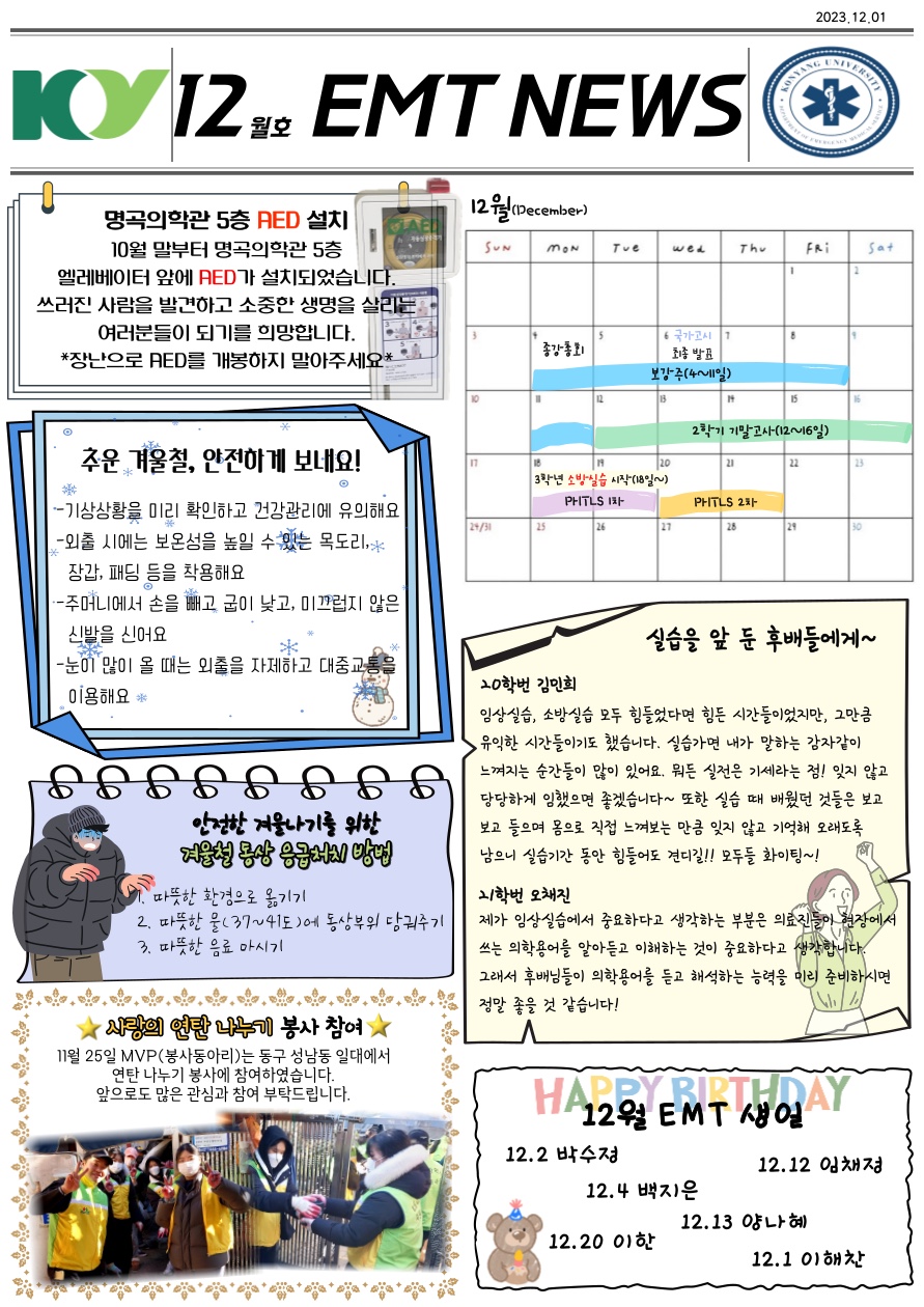 『 2023년도 12월 EMT NEWS 』글의 상세내용을 확인하는 표로 제목, 부서명, 등록일, 조회, 첨부, 내용으로 나뉘어 설명합니다.