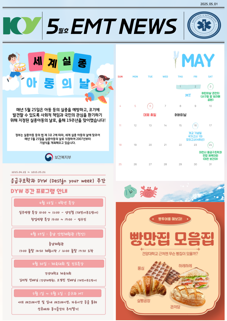 『 2025년도 05월 EMT NEWS 』글의 상세내용을 확인하는 표로 제목, 부서명, 등록일, 조회, 첨부, 내용으로 나뉘어 설명합니다.