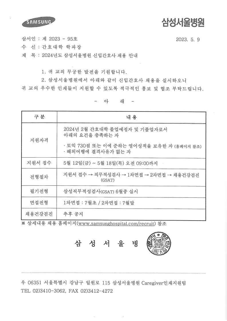 『 [채용공고] 2024년 삼성서울병원 신입간호사 채용공고 』글의 상세내용을 확인하는 표로 제목, 부서명, 등록일, 조회, 첨부, 내용으로 나뉘어 설명합니다.