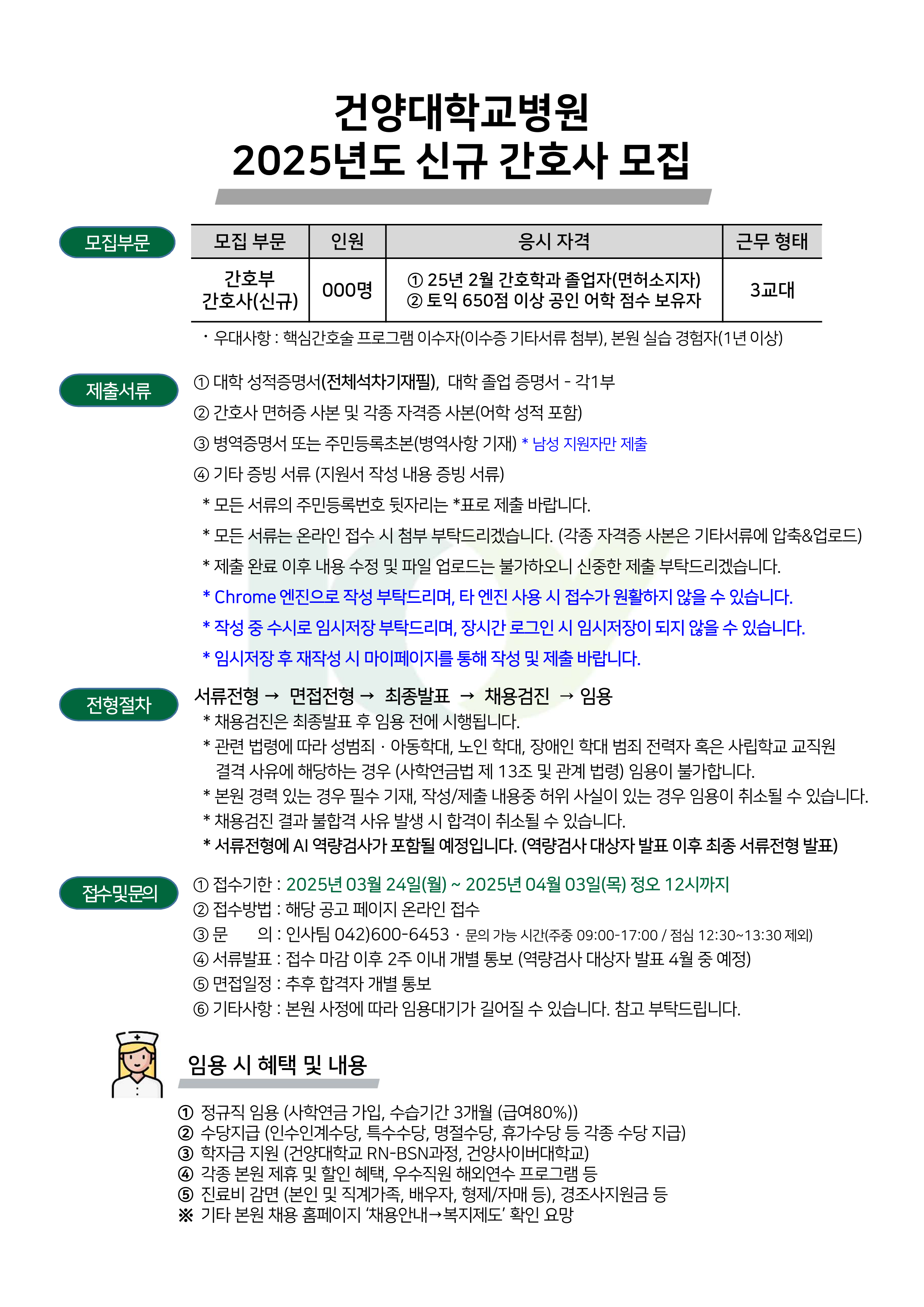 | 제목 | 건양대학교병원 2025년도 신규 간호사 모집 | ||||