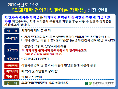 | 제목 | 2019학년도 1학기 「의과대학 건양가족 한아름 장학생」 신청안내 | ||||