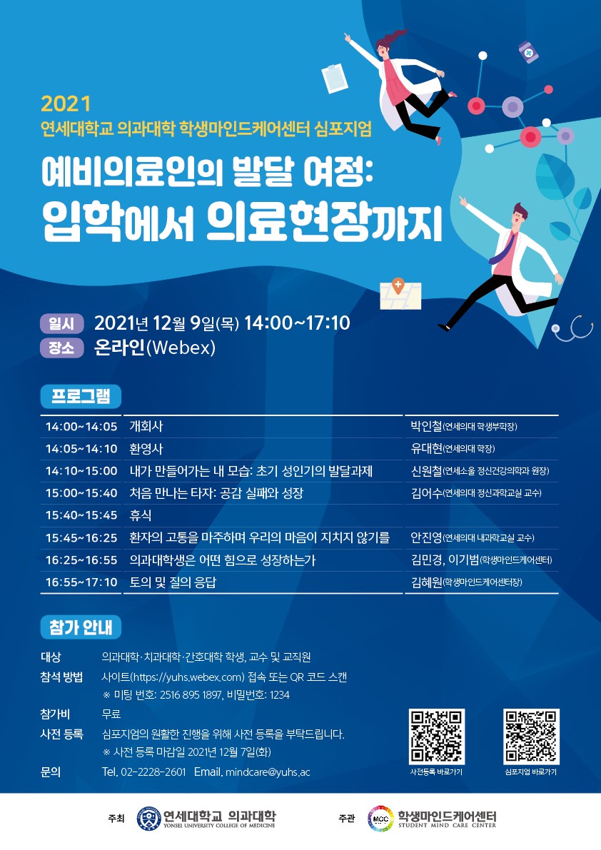 『 2021년 연세대학교 의과대학 학생마인드케어센터 심포지엄 참여 안내 』글의 상세내용을 확인하는 표로 제목, 부서명, 등록일, 조회, 첨부, 내용으로 나뉘어 설명합니다.