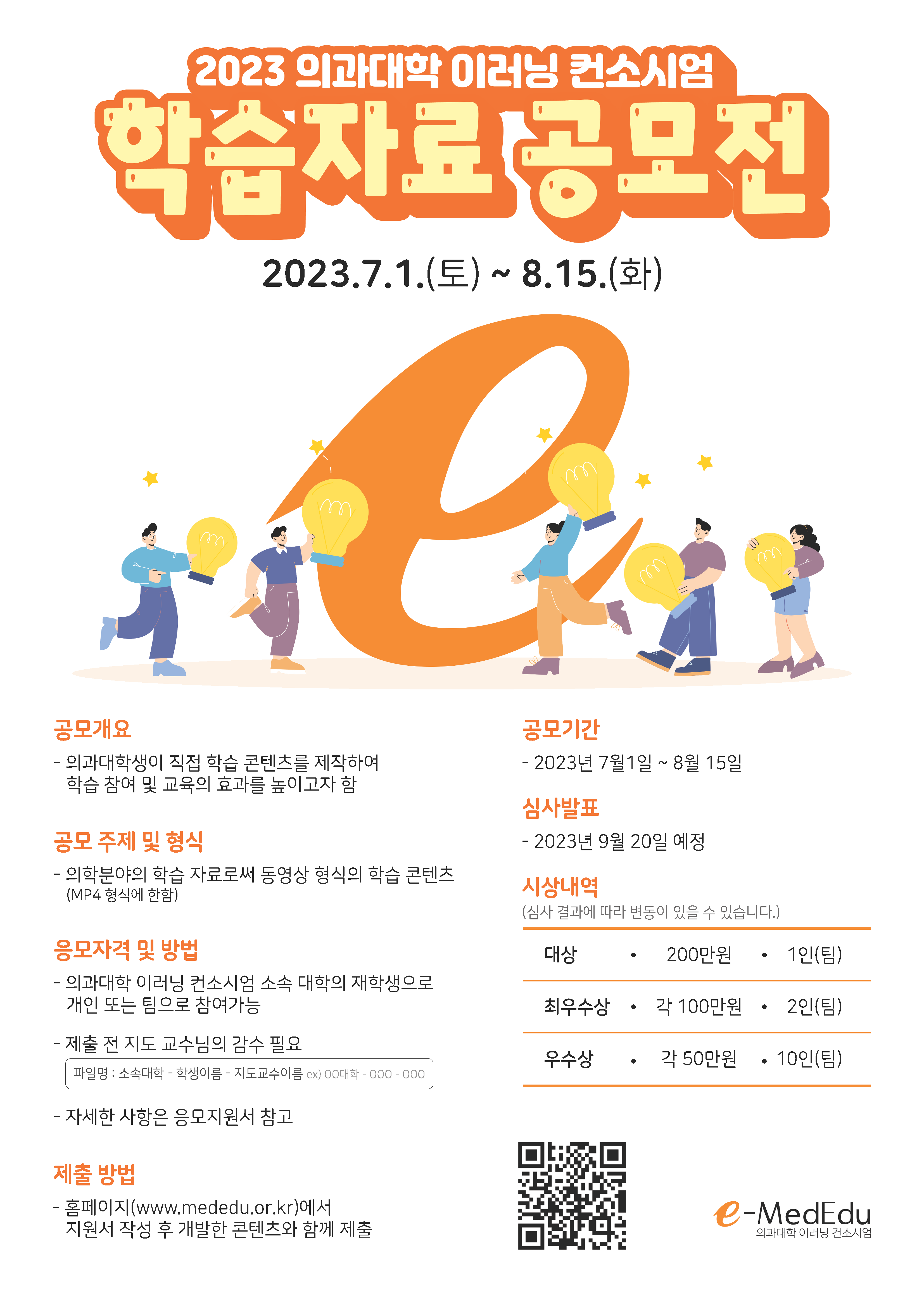 『 2023 의과대학 이러닝 컨소시엄 학습자료 공모전 안내(7.1.~8.15.) 』글의 상세내용을 확인하는 표로 제목, 부서명, 등록일, 조회, 첨부, 내용으로 나뉘어 설명합니다.