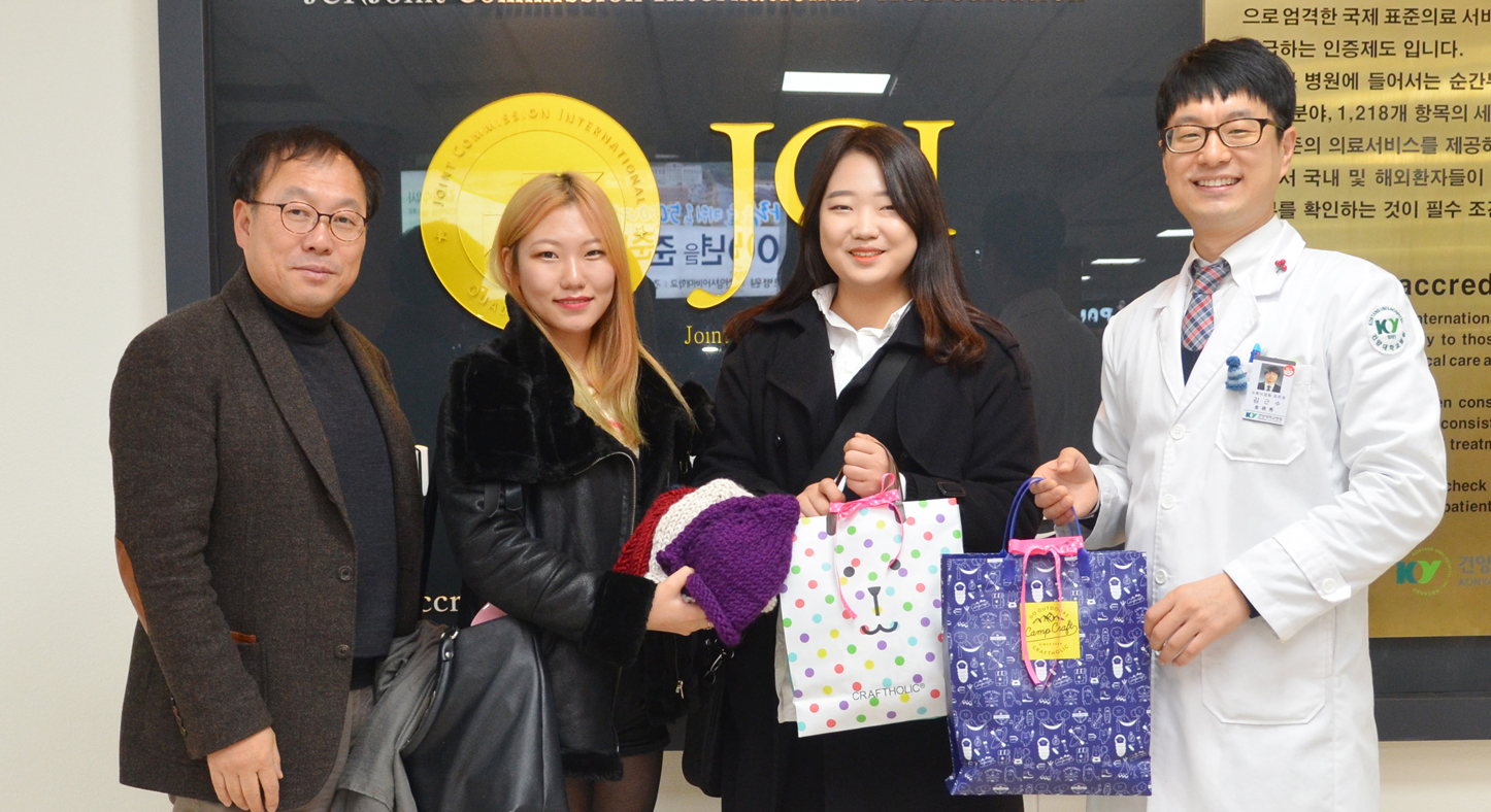 왼쪽부터 윤봉환 교수, 송윤지학생, 정인희 학생, 건양대병원 김근수 사회사업팀 파트장.jpg