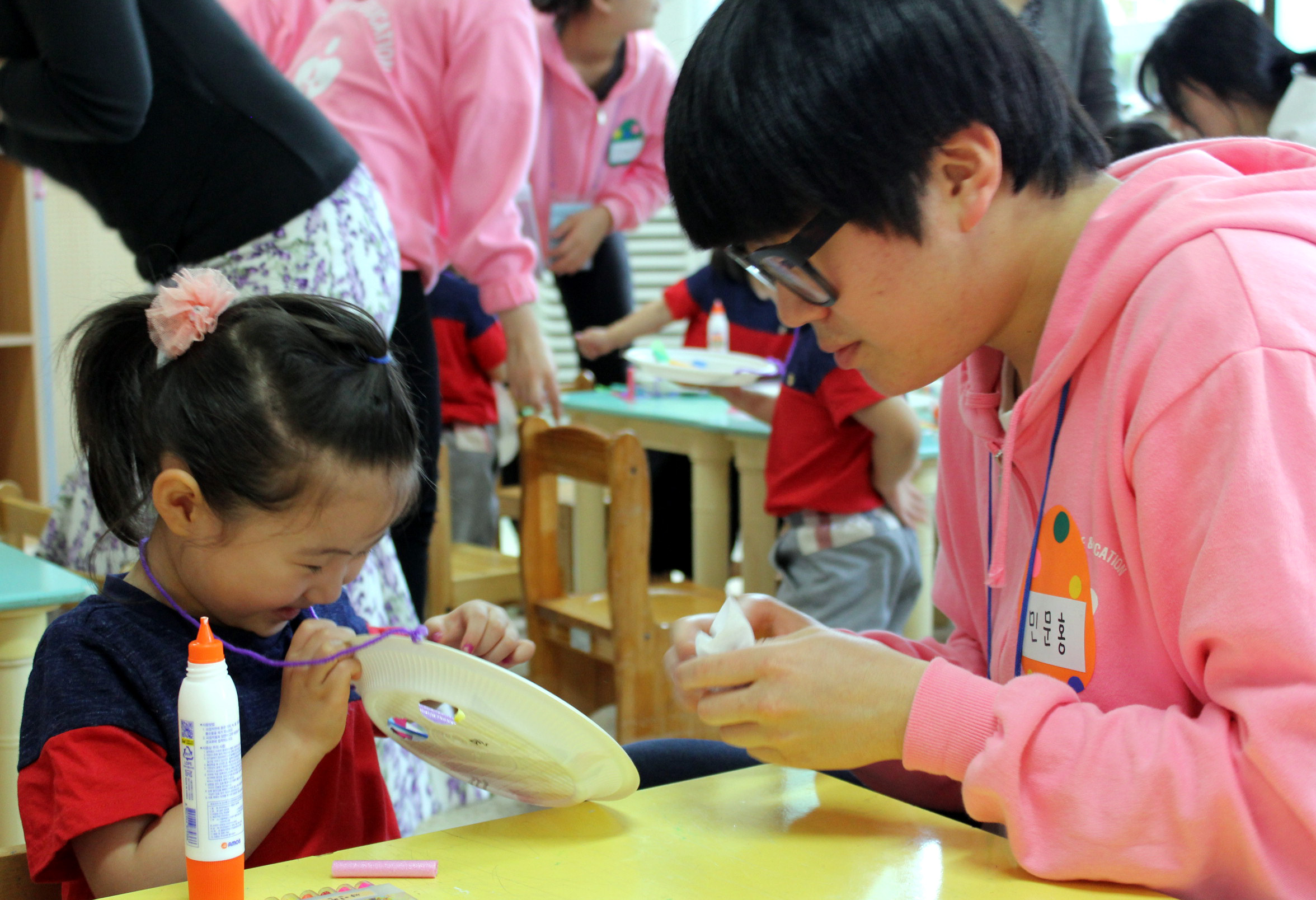 아동보육학과 학생들이 어린이들을 데리고 인디언 얼굴 꾸미기를 하고 있다.jpg