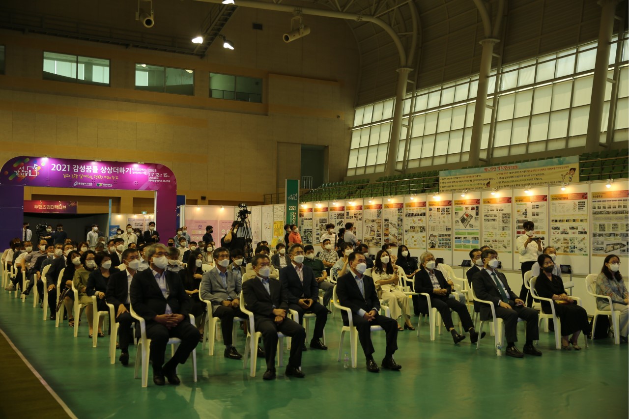 충남교육청 2021 감성꿈틀상상더하기 전시회, 건양대서 열려 충청남도교육청(교육감 김지철)과 건양대학교(총장 이철성) 산학협력단(단장 김웅식)이 공동 주관하는 <2021 감성꿈틀 상상더하기> 전시회가 2일부터 15일까지 건양대학교(총장 이철성) 논산 창의융합캠퍼스 짐나지움에서 진행된다. ‘앎과 삶을 설계하는 행복한 미래학교’라는 주제로 열리는 이번 전시회는 충청남도교육청 김지철 교육감을 비롯한 관계자와 충남도의회, 21감성꿈틀 전문지원기관, 감성꿈틀촉진자 등 사업관계자들이 참여한 가운데 2일 개막식이 열렸다. 학습과 동시에 놀이와 휴식이 공존하는 융합적이고 창의적인 학교공간을 만들기 위한 충남교육청 학교공간혁신사업인 ‘감성꿈틀사업’의 일환으로 개최되는 이번 전시회는 ‘20 감성꿈틀 19교’, ‘21 감성꿈틀 32교’, ‘19~21 고교학점제 10교’, 사용자 참여수업 결과보고서, 영상자료 등의 본전시와 이동식학교, 전자칠판, AR/VR 등 그린스마트 미래학교 기자재부스와 학교 신축공사 현상공모 당선작 패널 등의 특별전으로 진행된다. 첫날 개막식 행사는 교육기자재 전시회 관람 및 우수사례 발표, 테이프 커팅식 등으로 이루어진 이번 전시회는 코로나19로 인한 거리두기 방역 지침에 따라 관람대상을 지역별로 나눠 오는 15일까지 진행된다. |