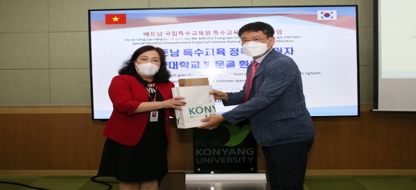 응우옌 티 킴 호아 베트남 국립특수교육원장(왼쪽)과 건양대 허용도 부총장이 선물을 교환하는 모습.JPG