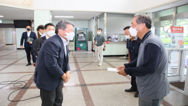 사진 2. 9일 임기 첫 업무로 교내 환경미화직원을 찾아 인사하고 금일봉을 건네는 김용하 건양대 총장(왼쪽)