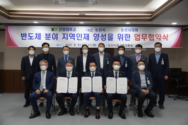 건양대학교(총장 김용하)와 논산시(시장 백성현), 논산시의회(의장 서원)가 31일 오후 논산시청에서 반도체 분야 지역인재 양성을 위한 업무협약을 체결하고 지역 내 반도체 인재 양성 및 논산시 스마트 국방산업 클러스터 구축에 힘을 모으기로 했다.