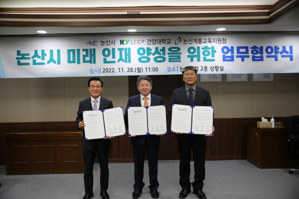 건양대학교(총장 김용하)와 논산시(시장 백성현), 논산계룡교육지원청(교육장 정원만)이 28일 오전 논산시 미래 인재 양성을 위한 업무협약을 체결했다.