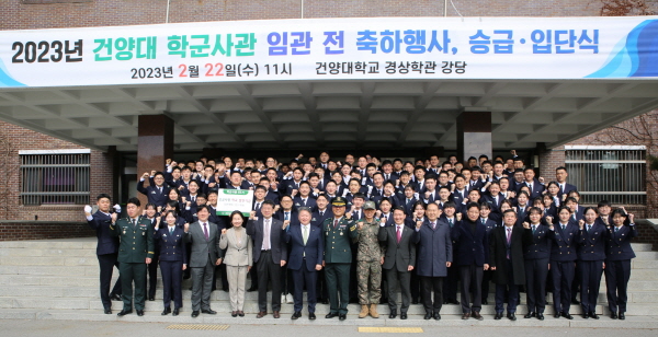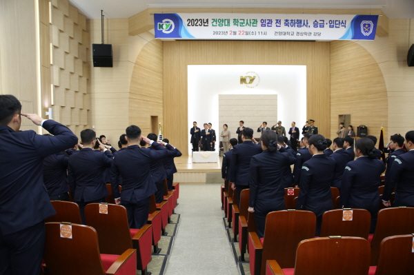 건양대학교(총장 김용하) 학군단(단장 이태희)은 22일 오전 건양대 창의융합캠퍼스 경상학관 강당에서 2023년 건양대 학군사관 임관 축하행사 및 승급·입단식을 개최했다.