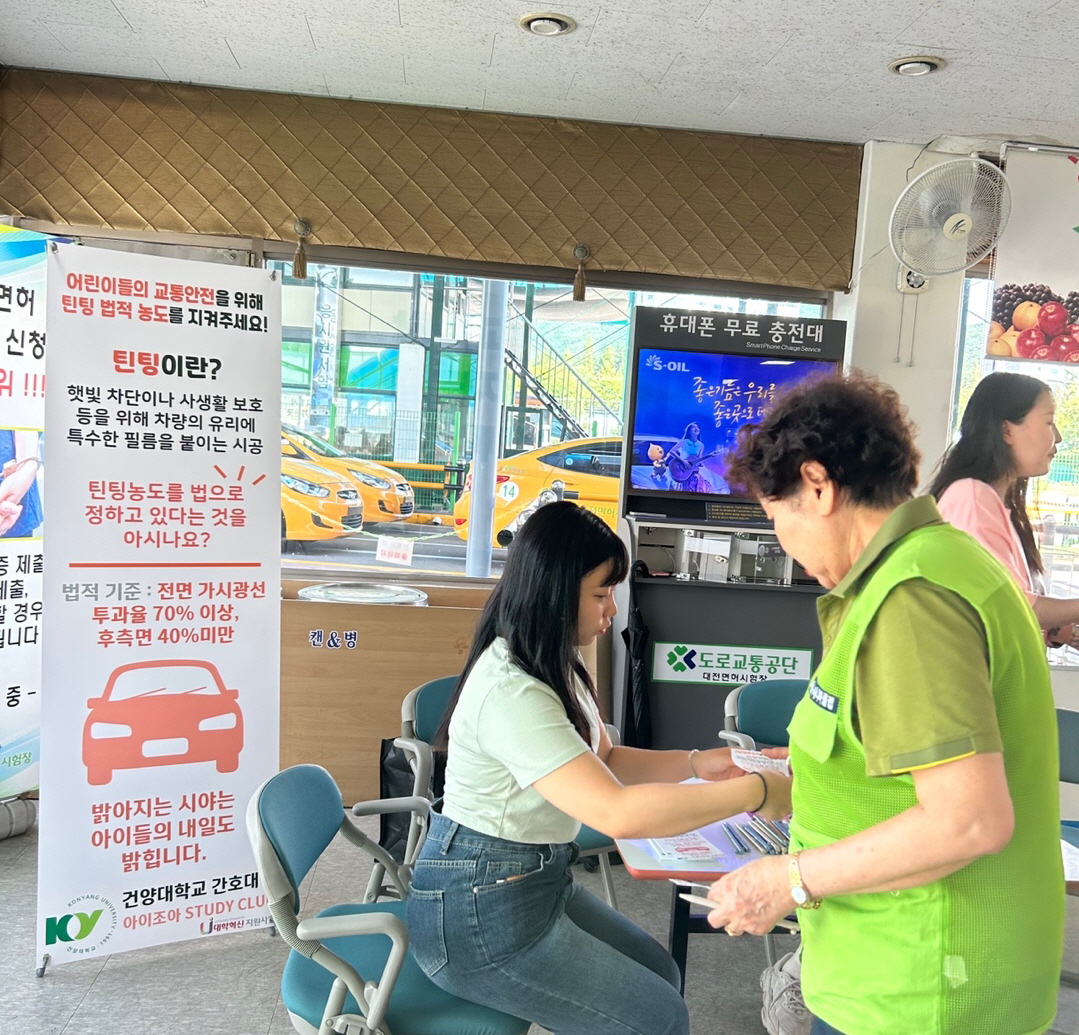 많은 시민들에게 이번 캠페인을 통해 홍보가 됐길 바란다” 등의 소감을 밝혔다. 건양대 간호대학 아이조아 Study Club의 허보윤 지도교수는 “햇빛 차단이나 사생활 보호 등을 위해 차량의 유리에 붙이는 필름(틴팅)의 농도가 법적기준 전면가시광선 투과율 70% 이상, 후측면 40% 미만이지만 지나치게 어둡게 시공하는 경우가 많다. 법적 기준을 지켜서 운전자와 운전자 간에 아이컨택 또는 수신호를 주고받을 수 있다면 밝아지는 시야만큼 아이들의 내일도 밝혀지지 않을까 생각한다. 캠페인 활동을 지원해준 대학혁신지원사업단에 감사하다”고 밝혔다. |