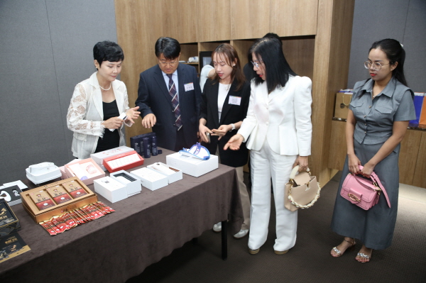 1일 대전 인터시티호텔에서 열린 대전권 대학연합과 베트남 유통기업 THUAN GIA사와의 행사장에서 THUAN GIA社 쩐 도 지에우 꾸에(TRAN DO DIEU QUE) 의장이 제품을 둘러보는 모습.JPG