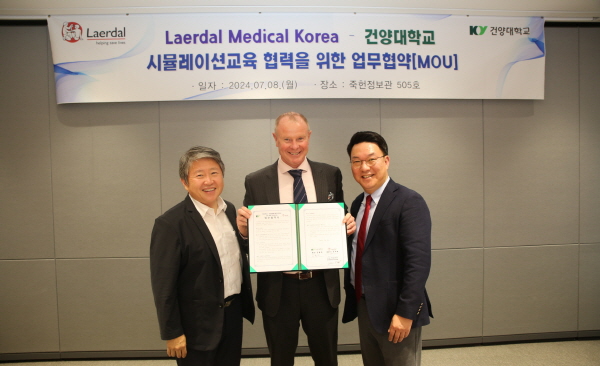 왼쪽부터 건양대 김용하 총장, 래어달 메디컬 Graeme Foulds 아시아 태평양 총괄 부사장, 레어달 메디컬 코리아 윤재훈 대표이사.jpg