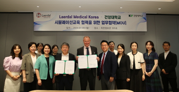 건양대-래어달 메디컬 코리아, 의료시뮬레이션 교육 협력을 위한 업무협약 체결 건양대학교(총장 김용하)는 8일 오후 대전 메디컬캠퍼스 죽헌정보관에서 세계적인 의료 시뮬레이터 교육기자재 제조기업인 래어달 메디컬 코리아(Laerdal Medical Korea: 대표이사 윤재훈)와 의료 시뮬레이션 교육을 위한 업무협약을 체결했다고 밝혔다. 노르웨이에 본사를 두고 있는 래어달 메디컬은 1940년 어린이책과 장난감 회사로 설립돼 현재 의료교육장비 및 교육솔루션을 개발생산하고 있으며 세계 시뮬레이터 교육 시장의 80%를 석권한 업계 1위 글로벌 기업이다. 한국지사를 비롯해 전세계 25개의 지사 및 1500명 이상의 직원이 근무하고 있으며 2007년 설립된 래어달 메디컬 코리아는 간호사, 응급구조사 경력자를 포함한 25명의 직원이 근무하고 있다. 건양대와 래어달 메디컬 코리아는 이날 업무협약을 통해 ▲시뮬레이션 관련 분야의 교육, 공동연구 및 기술정보 교환 ▲인적·물적 자원 등 상호교류를 통한 협력 등을 진행키로 했으며 특히 건양대 간호대학 KY시뮬레이션센터 구축에 적극 협력하고 향후 각종 교육 및 워크숍도 함께 하기로 했다. 이날 협약식에는 건양대 김용하 총장, 최임수 부총장, 임효남 간호대학장, 김윤정 간호시뮬레이션센터장이 참석했으며 래어달 메디컬 코리아 윤재훈 대표이사, 김용태 부장, 장문성 차장과 함께 레어달 메디컬의 아시아 태평양 총괄 부사장(Vice President Laerdal Asia Pacific)인 Graeme Foulds 씨도 배석했다. Graeme Foulds 총괄 부사장은 이날 협약식을 통해 건양대와 래어달 메디컬 코리아의 의료 시뮬레이터 기반 교육 협업을 강화하고자 하는 뜻을 밝혔다. 건양대 간호대학(학장 임효남)은 최근 보건복지부 <2024년도 간호대학 실습교육 지원사업> 수행기관에 선정되며 건양대 신축 보건학관 건물 1층에 의료분야 관련학과들의 시뮬레이션 교육을 위한 KY시뮬레이션센터(가칭)를 구축 중이다. 건양대 김용하 총장은 “오늘 협약을 통해 건양대와 Laerdal Medical Korea는 긴밀한 협업을 통해 중부권 최대의 의료 시뮬레이션 교육의 컨트롤타워가 되고자 한다. 특히 새로운 시뮬레이션센터는 건양대 의료관련학과 교육에 국한하지 않고 지역 병원 의료인력, 인근 대학 교원 및 학생들을 대상으로 한 시뮬레이션 교육을 함께 펼쳐 나가는 것과 동시에 관련분야 국내외 워크숍 및 학술대회를 개최해 건양대가 국내 의료시뮬레이션 교육의 중심이 되도록 할 것”이라고 밝혔다. |