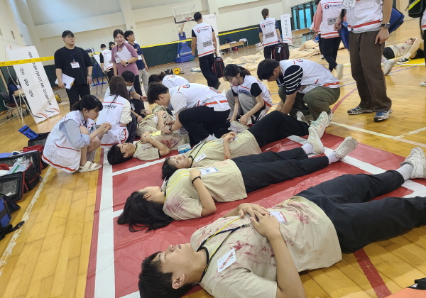 건양대 응급구조학과, 2024년 재난응급의료 비상대응매뉴얼 교육 지원 건양대학교(총장 김용하) 응급구조학과(학과장 박정희) 학생들이 21일 천안 재능교육연수원에서 국립중앙의료원 중앙응급의료센터가 주최한 ‘2024년 재난응급의료 비상대응매뉴얼 교육’에 모의 환자 역할로 참여했다. 이날 시행된 ‘2024년 재난응급의료 비상대응매뉴얼 교육’은 전국 권역응급의료센터 및 소방, 보건소 재난지원 의료 인력의 현장 대응 능력 향상을 위한 교육으로 가상의 현장 상황을 설정한 시나리오 기반 종합훈련으로 진행됐다. 이날 훈련에 참여한 응급구조학과 학생들은 재난 현장에서 현장응급의료소의 운영과 소방·보건소·권역응급의료센터 재난의료 대응팀들의 응급활동에 대한 모의 환자로 교육에 참여했다. 건양대 응급구조학과 박정희 학과장은 “이번 재난응급의료 비상대응매뉴얼 교육 지원 협조 요청을 해준 중앙응급의료센터에 깊이 감사드린다”며 “오늘 재난응급의료 비상대응매뉴얼 교육 참여를 통해 귀중한 경험을 한 학생들이 미래를 선도하는 역량 있는 현장 응급의료 전문가로 성장할 것이라 믿는다”고 밝혔다. 이날 교육에 참여한 학생들은 “재난 발생 시 인명피해를 최소화하기 위한 현장응급의료소의 운영과 119구급대원, 보건소 신속대응반, 권역응급의료센터 재난의료지원팀의 역할과 활동을 직접 경험하는 소중한 계기였다”고 말했다.