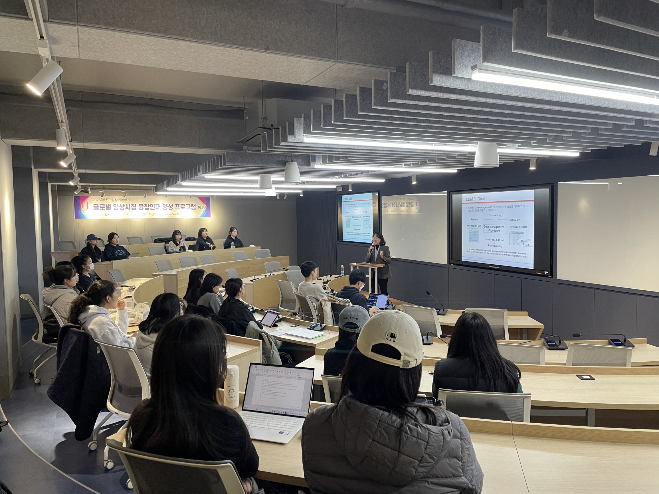 이번 프로그램은 신약 개발과 임상연구 전 과정을 아우르는 국제 기준의 교육으로 구성됐다. 구체적으로 프로젝트 관리, 데이터 관리, 품질 보증, 인허가 등 네 가지 핵심 내용을 담았고, 학생들이 실제로 다국가 임상시험을 이끌 수 있는 역량을 쌓을 수 있도록 했다. 참여 학생들은 각 분야 전문가로부터 현장의 실제 업무와 필요한 역량, 최신 기술 동향 등을 직접 들으며, 자신의 진로도 더욱 구체적으로 그려볼 수 있는 시간을 가졌다.