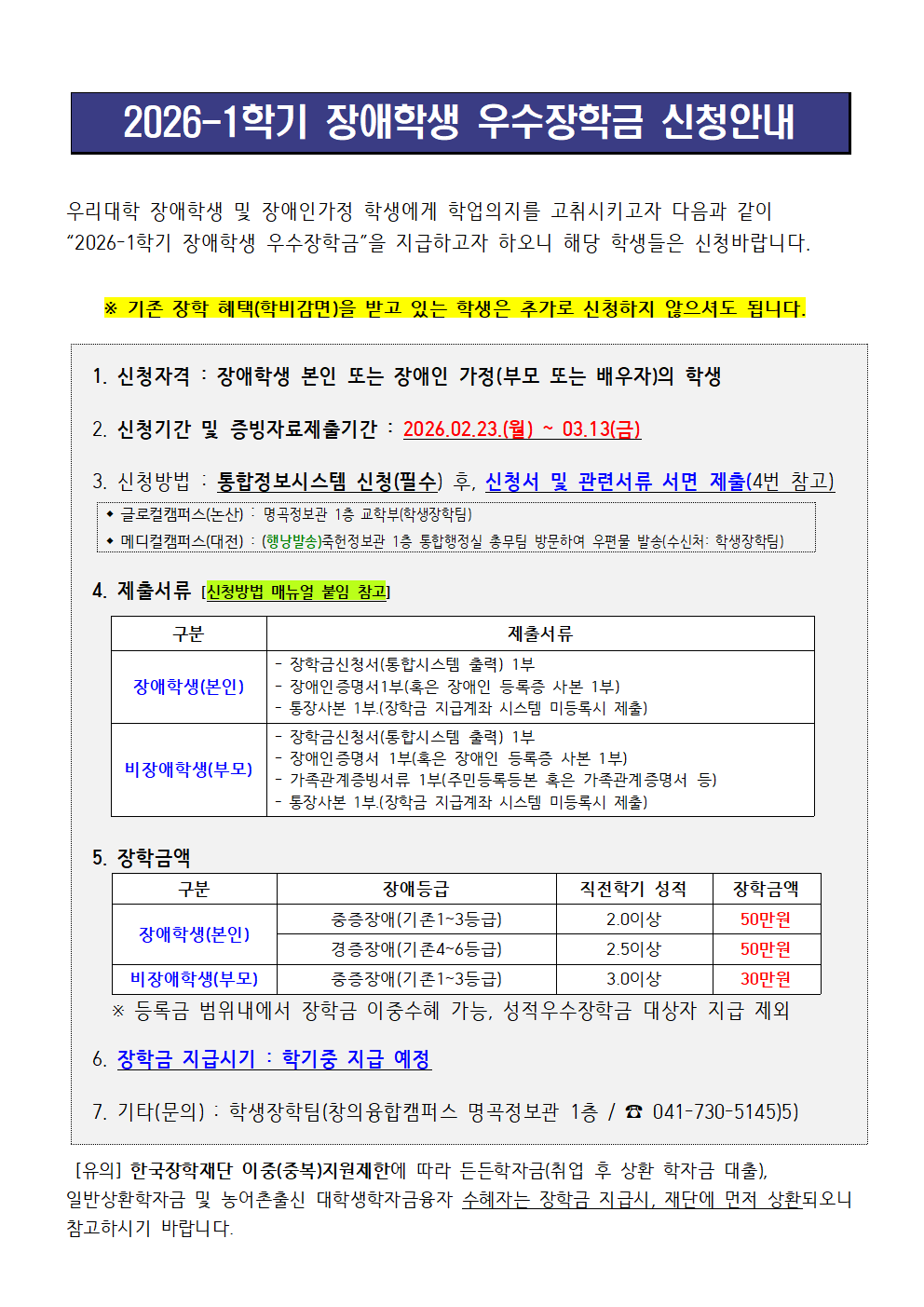 | 제목 | 2026-1학기 장애학생우수장학금 신규장학생 모집 안내 | ||||